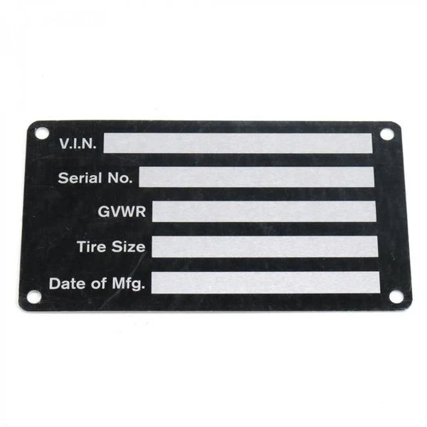 This anodized aluminum VIN plate with metallic finish is the perfect touch to any dash. Comes in black and silver. Tag your custom trailer. truck or equipment! Great for replacing lost. damaged or just hard to read identification plates. These tags meet inspection requirements for DMV. DOT. FMCSA. RRC. ICC and FMVSS. Let others know who is the proud owner. Personalize the blank fields to create a truly custom piece of art. This VIN name plate is 3.75 inches wide by 2.125 inches tall and is .5mm thick. It includes 3.5mm rivet holes in each corner for easy mounting. Fits all vehicles. Vintage Restoration Parts let you drive with the look of yesterday while delivering the performance of today's technology.FeaturesVIN Plate for Trailers. Trucks & EquipmentExpertly crafted from superior materialsProvide superior durabilityCompatibility:Trailers. Trucks & EquipmentSpecificationsWeight: 0.1 lbs