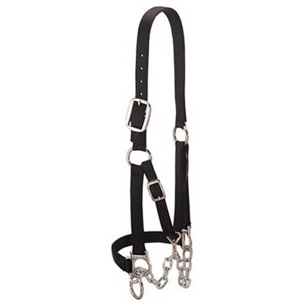 FeaturesHeavy DutyHeifer Restraint HalterFor Fairs & ShowsConstructed From Doubled & Stitched 1 in. NylonA Chin Choker Style Chain For Added ControlDurable Nickel Plated Hardware.Color – BlackSize – MediumDimension – 2 x 23 x 8 in.Item Weight – 1.5 lbs.