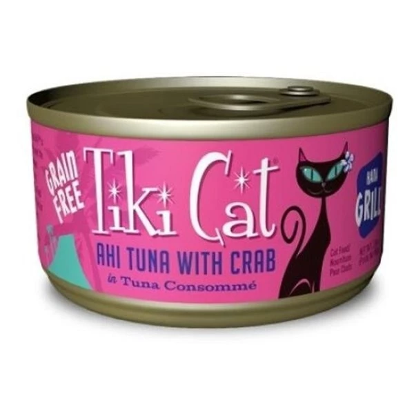 Tiki Cat Hana Grill Ahi Tuna & Crab Canned Cat Food Tiki Cat Hana wet cat food is made with whole meats. vitamins. minerals. and trace nutrients. It is grain. gluten. carbohydrate. strach. and flour free. It is high in protein and has a zero glycemic index. Suitable for all stages of life. Made in the Tiki Cat Hana Grill Ahi Tuna & Crab Canned Cat Food SpecificationsCapacity: 2.8 ozWeight: 2.1 lbs