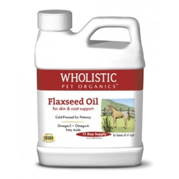 Wholistic Flax Seed Oilis a rich source of both Omega-3 and Omega-6 fatty acids. Good health is dependent on EFA's for normal cell functioning and to produce hormone-like substances necessary for energy metabolism and cardiovascular and immune health. Wholistic Flax Seed Oil. rich in lignans. is enhanced with rosemary. a powerful antioxidant and non-chemical preservative. FeaturesThe highest quality. cold-pressed flaxseed oil for beautifully healthy skin & coatHelps provide a beautiful and lustrous sheen in coatsNaturally-balanced source of EFAsIngredientsRich in lignan. a type of phytoestrogen. flaxseed oil is a rich sourse of Omega-3 & Omega-6 fatty acids. Good health is dependent on EFA's (essential fatty acids) for normal cell functioning and to produce hormone-like substances necessary for energy metabolism and cardiovascular and immune health.Feeding InstructionHorses 100-500 lbs: 1 ozHorses 501-1000 lbs: 1.5 ozHorses 1001 lbs and over: 2ozSpecificationsWeight: 128 oz