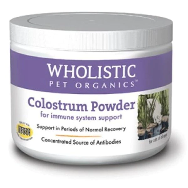 Wholistic Colostrum Powderrepresents nature's complete package. Colostrum is fondly known as "Mother's First Milk" because it is the very first nourishment that the newborn receives before the production of "milk". Colostrum is loaded with all the benefits necessary to sustain life and. furthermore. contains the all-essential Mother's antibodies that help protect the helpless newborn from the environment's assault. Without Mother's antibodies to protect the newborn from pathogens. the newborn would quickly succumb. Wholistic Colostrum Powderis an extremely concentrated powdered form of bovine colostrum offering 500 mg of pure colostrum per 1/4 teaspoon. collected from strictly controlled US origin dairy herds that are fed diets free of meat by-products. hormones. antibiotics and pesticides. and processed in UDSA licensed & inspected human food processing plants. For purity. efficacy. and guaranteed quality. Wholistic Colostrum Powderis the first choice in providing your pet with passive immunity (immunoglobulins IgA. IgM. IgG. lactoferrin) during times of stress. illness. and/or periods of recovery or for general immune function support. FeaturesA 100% pure form of "mother's first milk . just better!Freshly collected. concentrated and tested for guaranteed immunoglobulin levels500 mg of pure bovine colostrum in every 1/4 teaspoonCollected from strictly controlled US-origin dairy herds that are fed diets free of meat by-products. hormones. antibiotics and pesticidesProcessed in USDA licensed & inspected human food processing plantsEspecially useful during times of increased stress and periods of normal recovery and/or general immune function supportSpecificationsWeight: 3 oz
