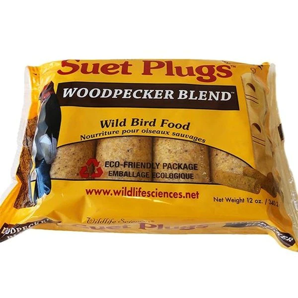 Contains 4 individual suet plugs which insert into a wooden suet plug feeder. Candy bar style wrapper is easy to open. Suet plugs are agreat way to feeder suet to tree clinging and insect eating birds. Wood plug feeders act as natural feeding area for woodpeckers and nuthatches. FeaturesWoodpecker blend suet plug bird foodSpecificationsWeight: 0.75 lbs