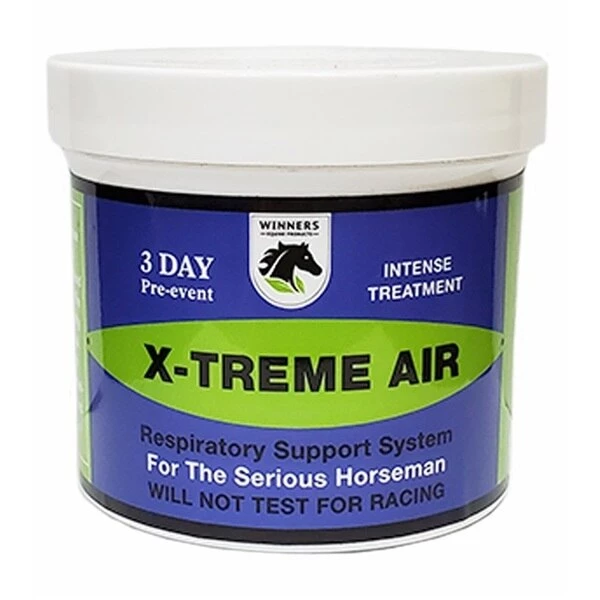 Winners Equine Products X-Treme Air 3 Day Pre-Event Treatment features a proprietary blend of 10 herbs and vitamins medically proven to work including Yunnan Baiyao. Compliant with EFI and USEF regulations. Can be used in all racingjurisdictions and will not test.X-Treme Air Racing Protocol:Step 1. X-Treme Air Daily herbs as directed, every day.Step 2. X-Treme Air 3 Day Pre-Event, starring 3 days before event or breeze. Continue with daily herbs as well.Step 3. X-Treme Boost Paste 4 – 6 hours before event. For extra protection give one full tube the night before and one tube the morning of the event. Step 4. Follow Winners Equine Products Do's and Don'ts nutrition protocol for maximum success. Here is a suggested list of Do's and Don'ts for horses that bleed.Don'ts…Cut out these things as much as possible:OatsSugar and high sugar productsMolassesCorn and corn productsVegetable oil that contains cornCreatineB-12. While B-12 is great for many horses, it is not good for horses that bleed or have respiratory issues. Do's….Things that you can substitute with much better benefits without negative consequences:Beet pulp or beet pulp based grainFresh ground flax seedCut your sweet feed 50/50 with a high protein/fat grain with low or no sugar/no molasses, NSC (non-structural carbohydrates).Substitute honey in place of sugar/molasses. This will sweeten the food naturally. Use locally harvested honey when possible. This will help with allergies and honey is a natural antibiotic. Rice bran oilVitamin CProper veterinary careUse Winners Equine X-Treme Daily Respiratory Treatment as directed.Use Winners Equine X-Treme 3 day and X-Treme Boost before the event.Winners Equine Daily Respiratory Health Treatment will not only help your horse to slow or stop bleeding but will also help with inflammation, circulation, mucus control, allergies, hoof growth, brain function, stamina and many other benefits. If you have questions about nutrition or our products, we at Winners Equine Products are here to help! By making these changes your horse will feel better and perform better.Did you know horses on layup and stall rest will benefit from these daily herbs? Because of the dust from shavings, hay and environment allergens horses will get mucus and allergy symptoms, but Winners Equine Daily herbs will help them stay healthy.Why are Winners Equine products able to help with so many things?Because when the respiratory system is working at full capacity, the oxygen level in the blood is increased which effects the entire body in a positive way.Note: Winners Equine Products are designed for healing and they are preventative maintenance products. If a horse has a lung infection, treat with veterinary protocols and use X-Treme Air Daily Treatment to rebuild and maintain respiratory health and wellness. Scientifically designed to help your horse win!