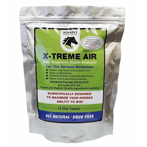 Winners Equine Products X-Treme Air Daily Respiratory Health Treatment features a proprietary blend of the highest quality natural ingredients including botanicals, herbs and vitamins. Compliant with EFI and USEF regulations. Can be used in all racingjurisdictions and will not test.X-Treme Air Racing Protocol:Step 1. X-Treme Air Daily herbs as directed, every day.Step 2. X-Treme Air 3 Day Pre-Event, starring 3 days before event or breeze. Continue with daily herbs as well.Step 3. X-Treme Boost Paste 4 – 6 hours before event. For extra protection give one full tube the night before and one tube the morning of the event. Step 4. Follow Winners Equine Products Do's and Don'ts nutrition protocol for maximum success. Here is a suggested list of Do's and Don'ts for horses that bleed.Don'ts…Cut out these things as much as possible:OatsSugar and high sugar productsMolassesCorn and corn productsVegetable oil that contains cornCreatineB-12. While B-12 is great for many horses, it is not good for horses that bleed or have respiratory issues. Do's….Things that you can substitute with much better benefits without negative consequences:Beet pulp or beet pulp based grainFresh ground flax seedCut your sweet feed 50/50 with a high protein/fat grain with low or no sugar/no molasses, NSC (non-structural carbohydrates).Substitute honey in place of sugar/molasses. This will sweeten the food naturally. Use locally harvested honey when possible. This will help with allergies and honey is a natural antibiotic. Rice bran oilVitamin CProper veterinary careUse Winners Equine X-Treme Daily Respiratory Treatment as directed.Use Winners Equine X-Treme 3 day and X-Treme Boost before the event.Winners Equine Daily Respiratory Health Treatment will not only help your horse to slow or stop bleeding but will also help with inflammation, circulation, mucus control, allergies, hoof growth, brain function, stamina and many other benefits. If you have questions about nutrition or our products, we at Winners Equine Products are here to help! By making these changes your horse will feel better and perform better.Did you know horses on layup and stall rest will benefit from these daily herbs? Because of the dust from shavings, hay and environment allergens horses will get mucus and allergy symptoms, but Winners Equine Daily herbs will help them stay healthy.Why are Winners Equine products able to help with so many things?Because when the respiratory system is working at full capacity, the oxygen level in the blood is increased which effects the entire body in a positive way.Note: Winners Equine Products are designed for healing and they are preventative maintenance products. If a horse has a lung infection, treat with veterinary protocols and use X-Treme Air Daily Treatment to rebuild and maintain respiratory health and wellness. Scientifically designed to help your horse win!