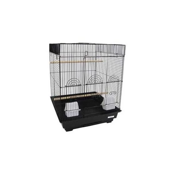Bird cage.Color: Black.Large swing outdoor with door pin and two small lift up doors.2 Feeder doors and 2 cups.2 Perches.Easy clean removable metal grate.Easy clean slide out bottom plastic tray.Non-toxic epoxy.Bar spacing: 0.38".Overall dimensions: 23" H x 18" W x 18" D.