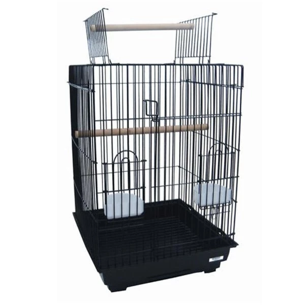 Includes 2 feeder doors. 2 plastic cups and 2 perches.Color: Black.Large swing-out door.With open top.1 perch inside the cage and 1 perch on top of the cage.Easy clean removable metal grate.Easy clean slide out bottom plastic tray.Non toxic epoxy.Assembly required.Bar spacing: 0.75".Gauge: 7.Dimensions: 27" H x 18" W x 18" D.Open top: 32.5" H (cage only).