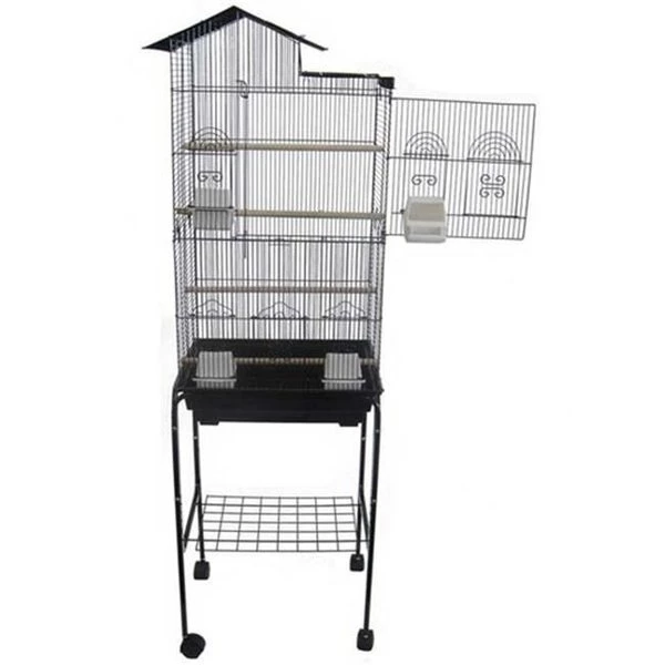 Bird cage with stand.Color: Black.Large swing out door with door pin and two small lift up doors.4 Feeder doors and 4 cups.4 Perches.Easy clean removable metal grate.Easy clean slide out bottom plastic tray.Stand to move around.Non-toxic epoxy.Bar spacing: 0.38".Cage dimensions: 36" H x 18" W x 14" D.Overall dimensions: 60" H x 18" W x 14" D.
