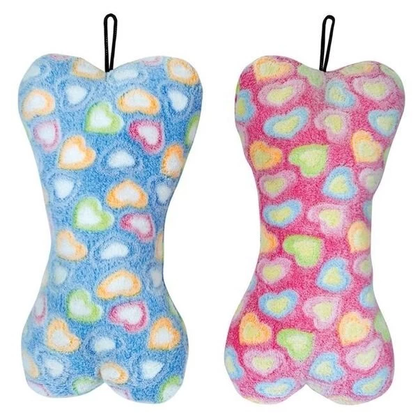 Poly-filled plush bone toys with sweetheart pastel pattern and squeaker will be irresistible. 7.5" bones are perfect for snuggling and play. Great for restocking retail displays and promoting impulse buys. SpecificationsColor: PinkSize: 7.5 in.Weight: 0.12 lbs